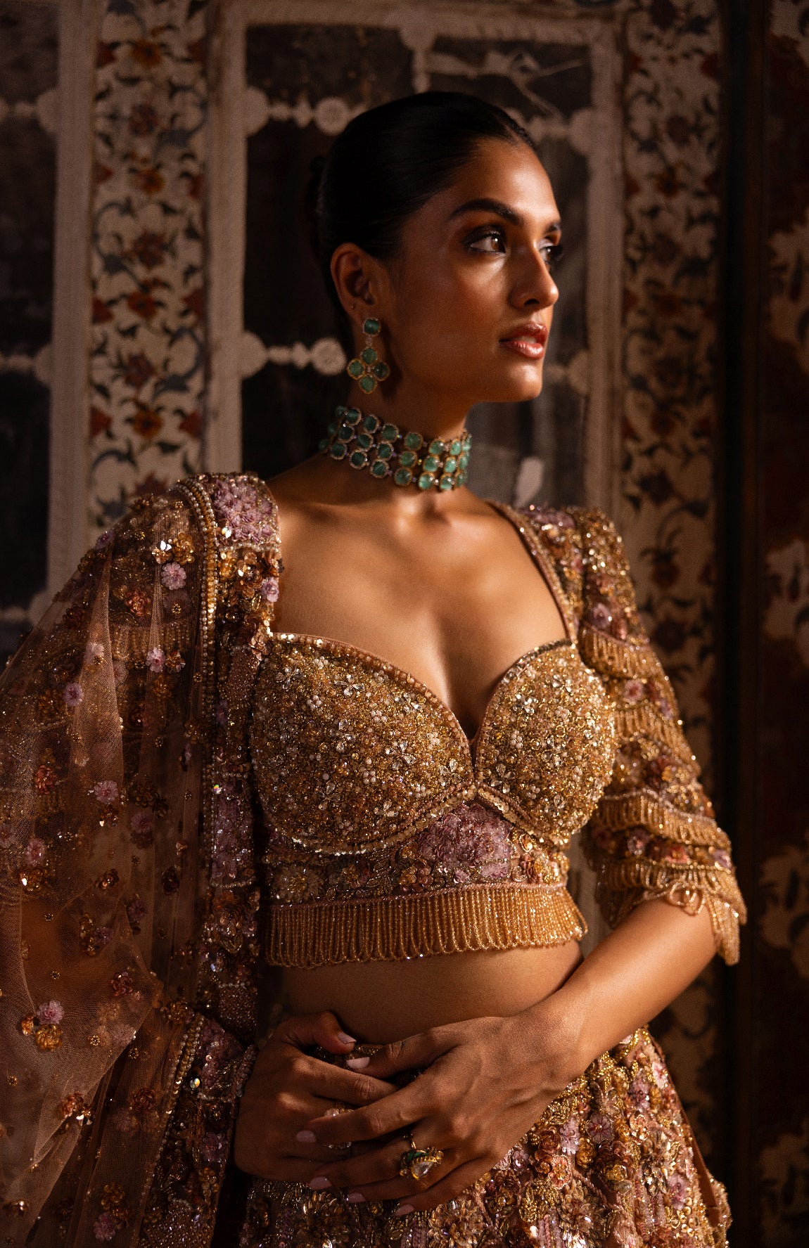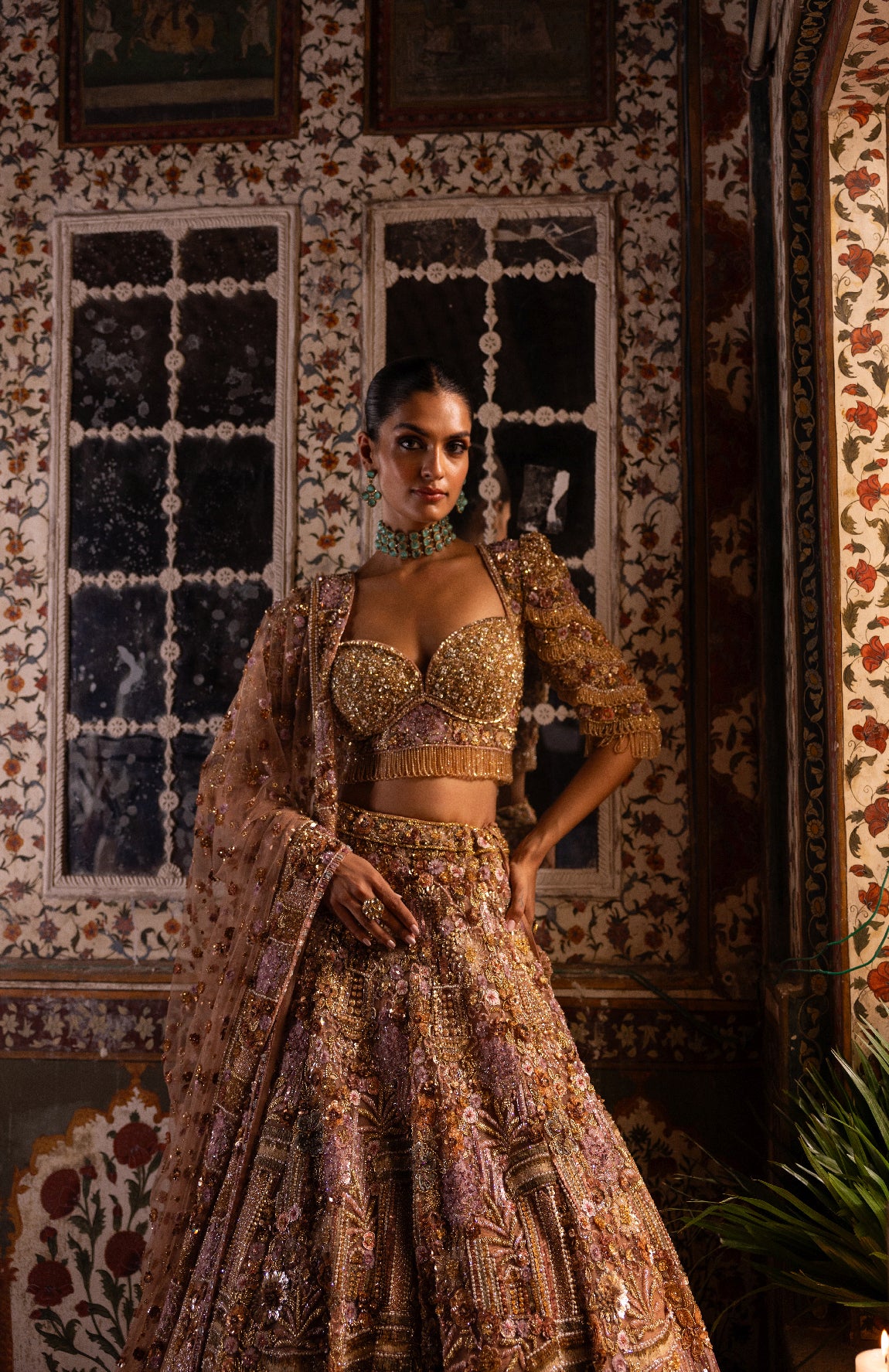 This lehenga set features intricate peach embroidery crafted with assorted crystals and stones in a geometric pattern. Accentuated with multi-coloured crystals in varying shapes and sizes, the blouse showcases a plunging neckline and a crystal-embellished crisscross back, finished with tassels at the waist. The embroidered dupatta is detailed with crystal tassels on all four sides.