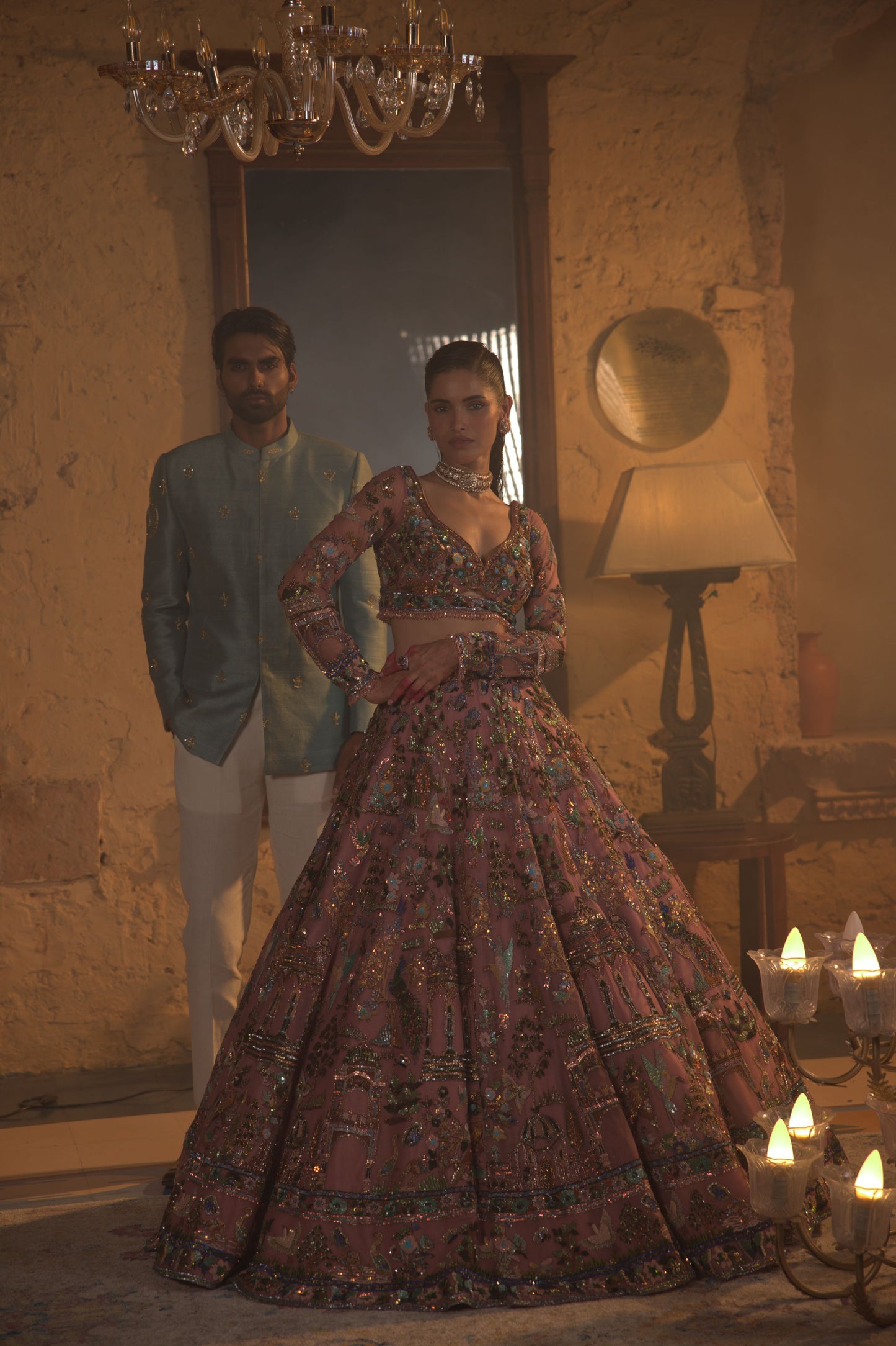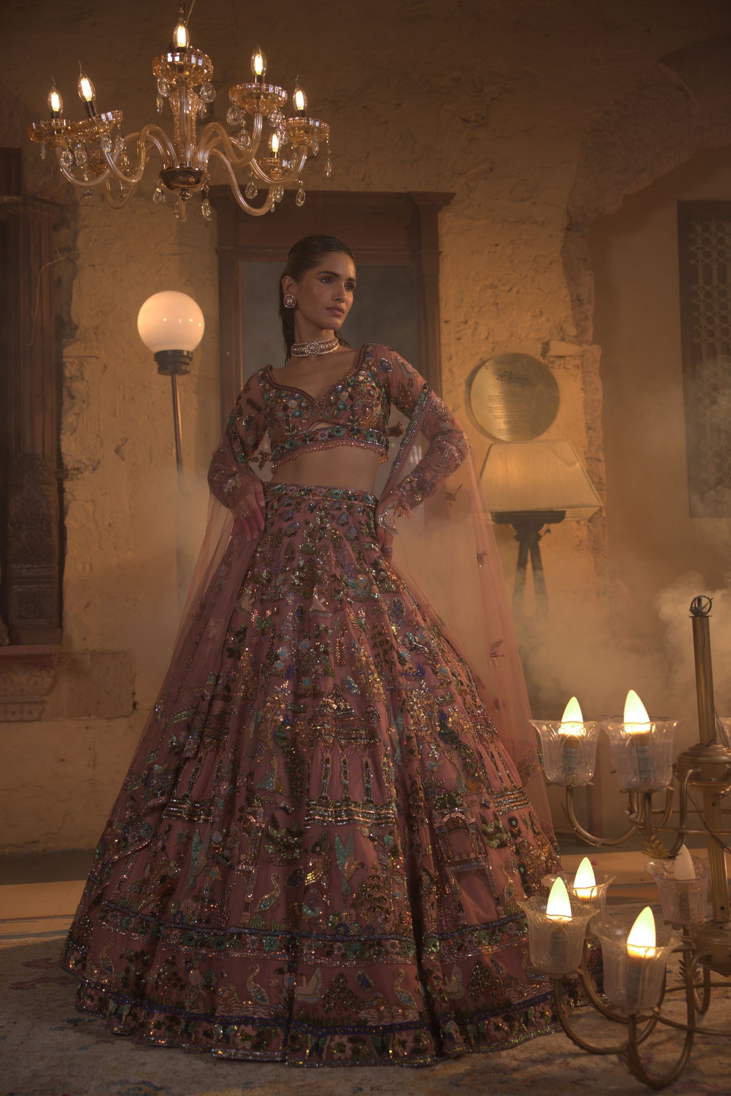 This Lehenga Set Features Heavily Embroidered Three-Dimensional Embroidery In A Multitude Of Colours. The 3D Flowers Are Further Accentuated With Crystal, Bugle Beads And Platinum Cut Sequins. The Full Sleeves Blouse Is Fully Embroidered And Shows Delicate Gold Tassels At The Waist. It Is Paired With The Heavily Embroidered Dupatta Having A Matching Border And Floral Motifs All Over.