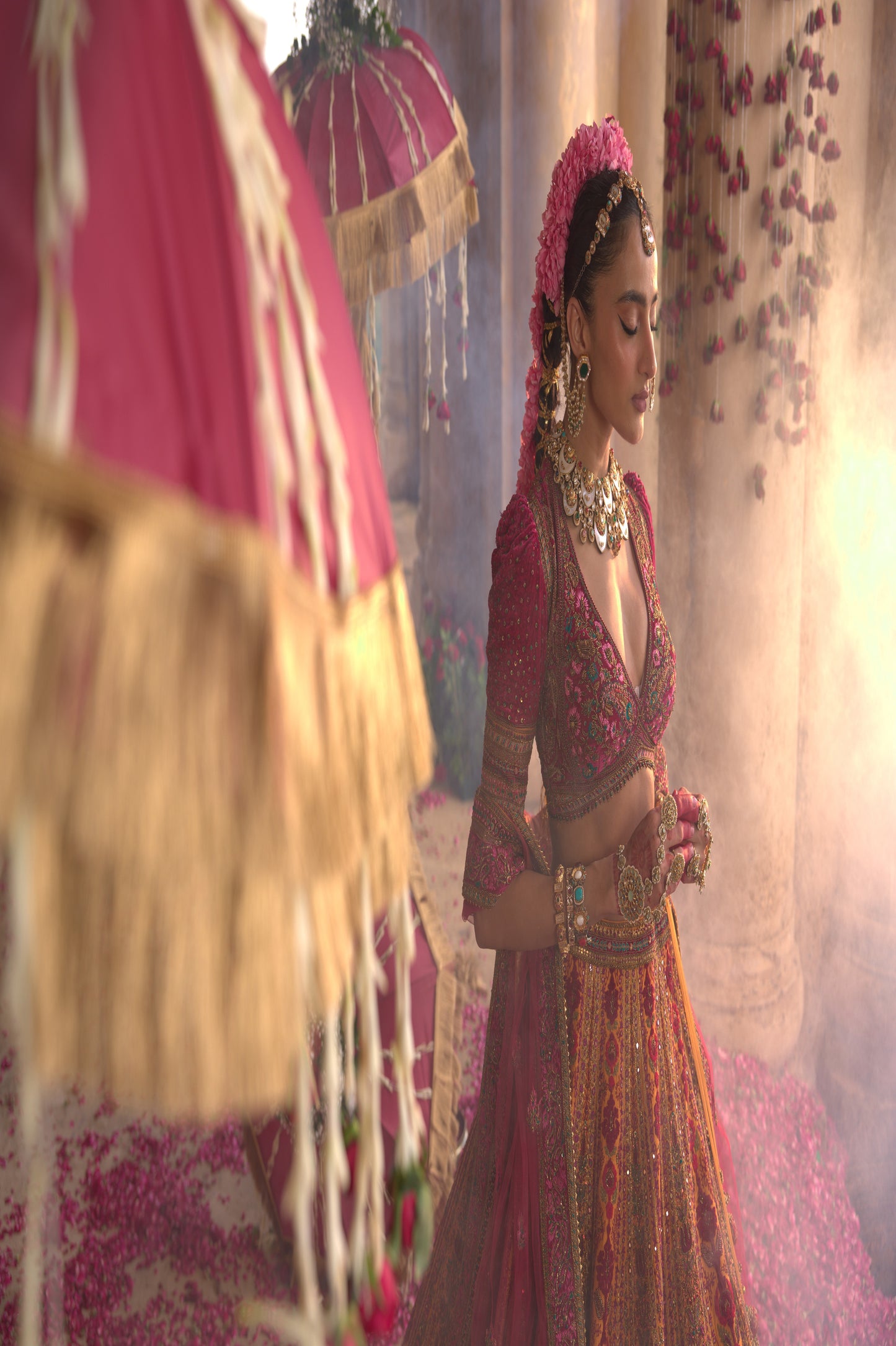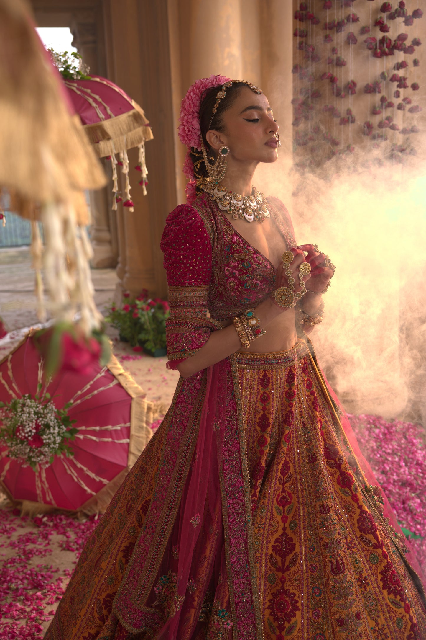 This mustard silk lehenga with intricate 3D Aari embroidery is a vision of elegance and heritage craftsmanship.