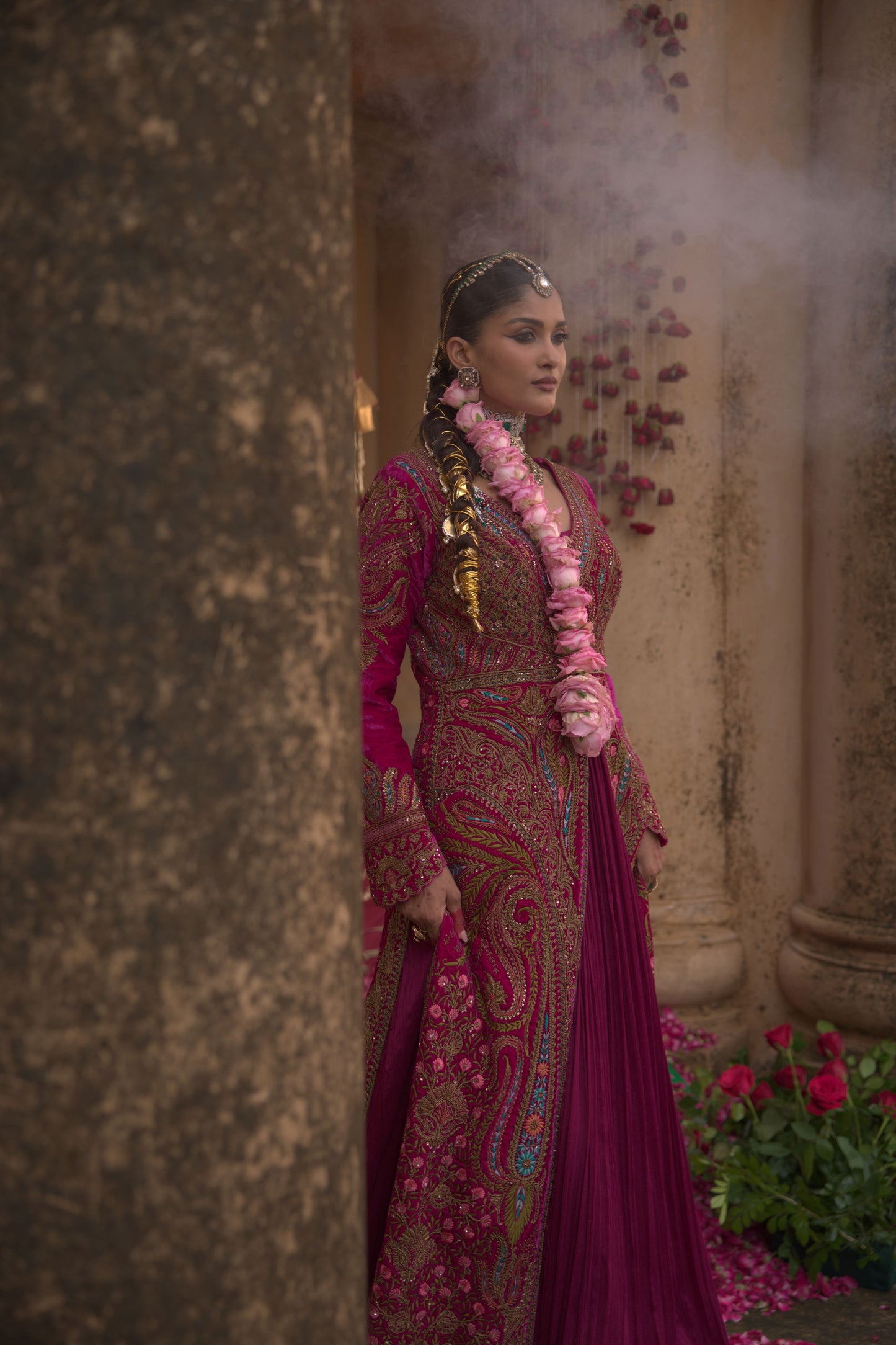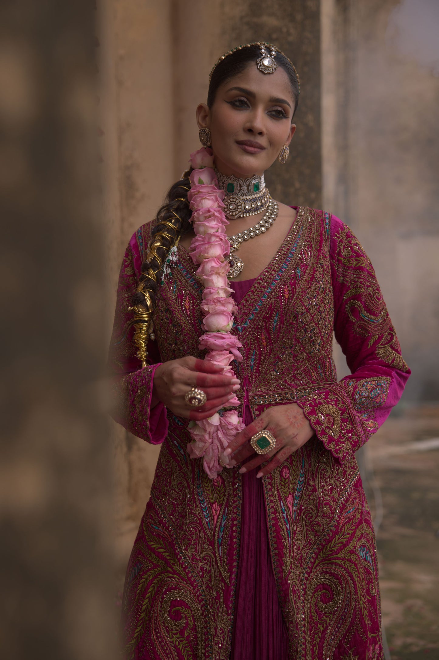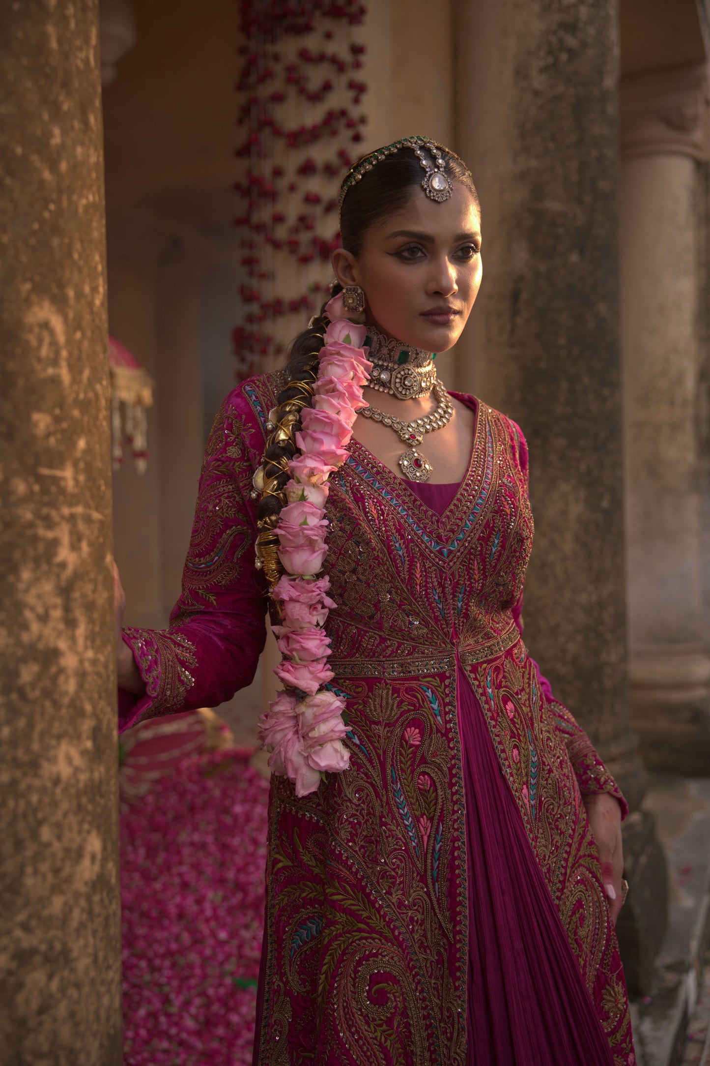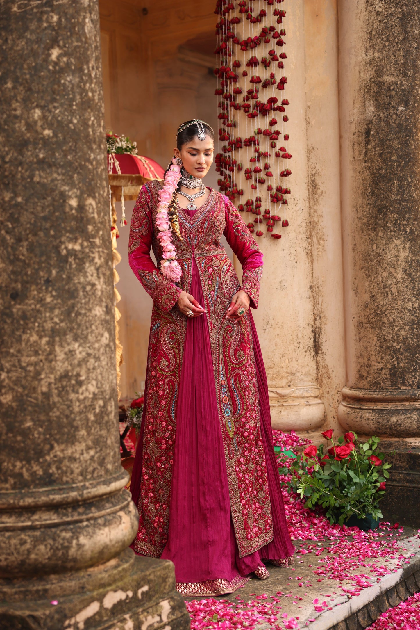 Regal elegance in every stitch. This ruby wine velvet Achkan, adorned with exquisite multicolor thread embroidery, reflects the rich essence of Kashmiri craftsmanship.