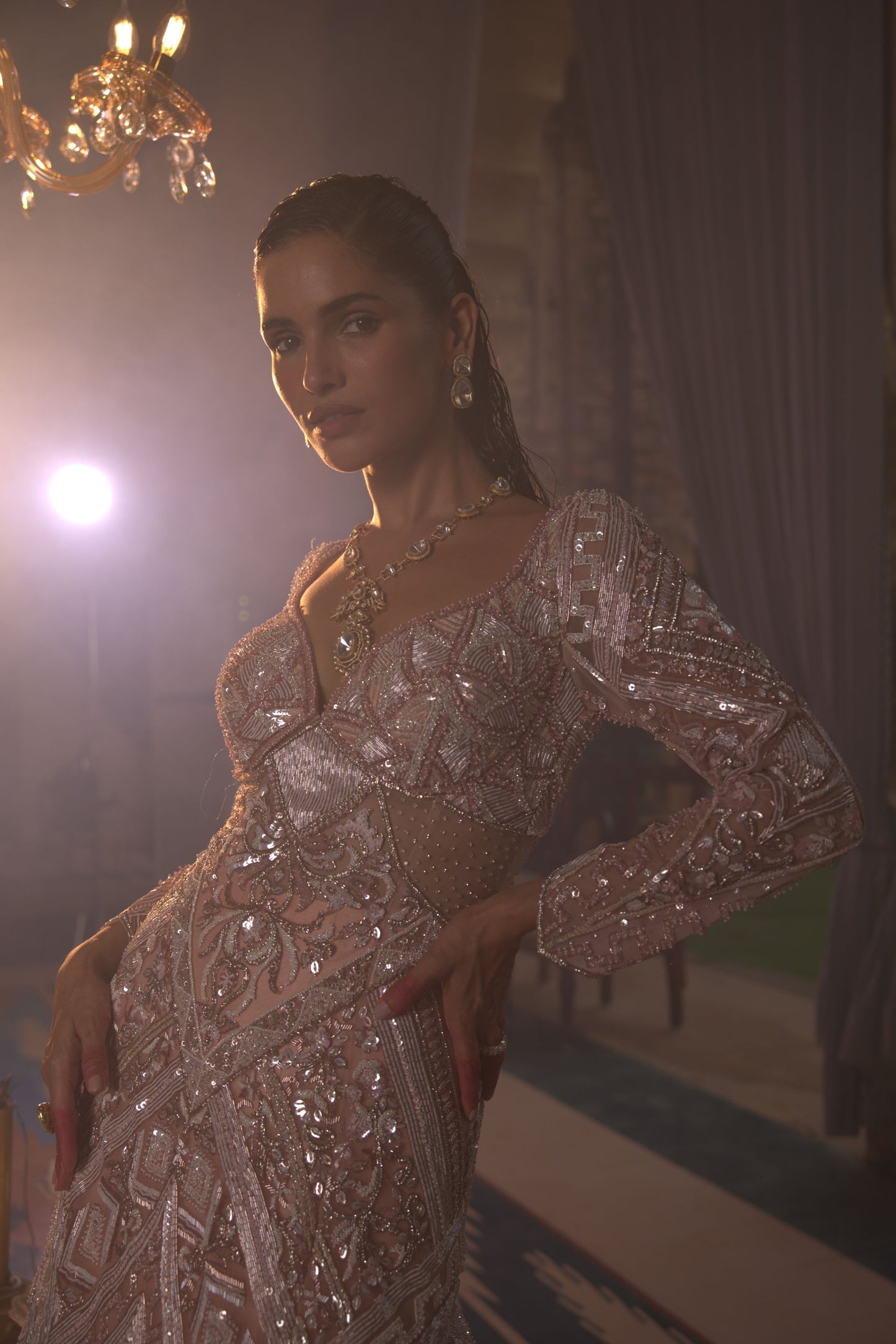 Elevate Your Ensemble With This Exquisite Silver Fish-Cut Gown With Beige Base, Richly Embellished With Continuous Cutdana And Zarkan Embroidery. The Design Is Beautifully Enhanced By Subtle Silver Beads And Delicate Tassels On The Sleeves, Perfect For A Chic And Sophisticated Look.